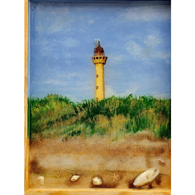 De Van Speyk is an impressive lighthouse in Egmond aan zee. The painting is painted with acrylic paint and cast with epoxy. The sand and the shells come from the beach of Egmond.