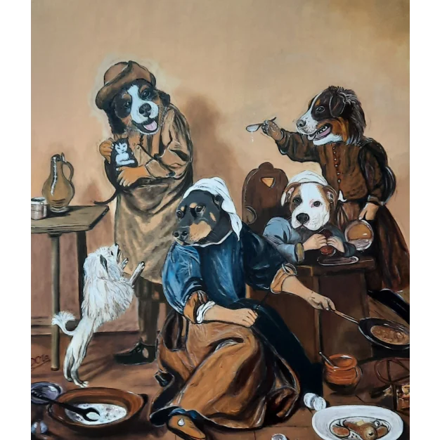 Ich bin ein großer Fan von Jan Steen, ich liebe seinen humorvollen Malstil. Kinder, die Pfannkuchen backen, ist mit einem Augenzwinkern auf das Gemälde von Jan Steen gemacht.