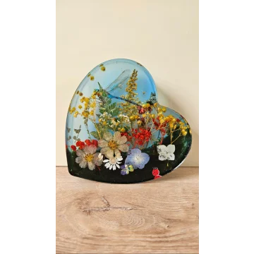 Handgefertigte schräg epoxy Vase mit eingegossenen getrockneten Blumen und einer roten Libelle. Wasserdichtes Röhrchen für einige natürliche Blumen. Immer Blumen im Haus.