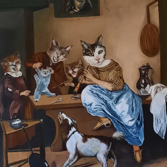 Hello! My name is Dora, born in Alkmaar. I started painting as a self-taught artist in 2007. In 2015, I began taking lessons from Jolanda Gerrmann in realistic fine painting according to the old 17th-century technique of Rembrandt. My oil paintings are realistic, humorous, and colorful. I love painting portraits, especially of animals. We often attribute human traits to animals (anthropomorphism); in my paintings, the animals behave like humans. I live in Egmond aan Zee, not far from the sea, which comes in handy. The sea has a great attraction for me and is regularly found in my works. In the summer of 2024, I discovered epoxy and can combine this very well with my paintings to create a 3D effect. Feel free to take a look at my site