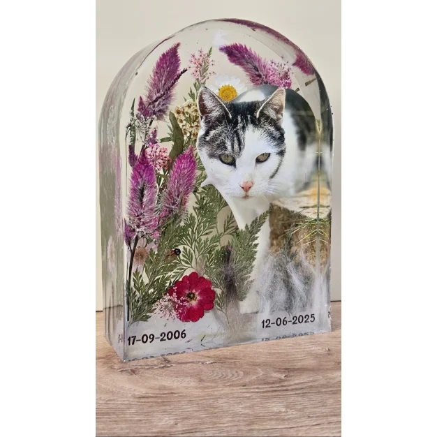 For the passing of Minoes, my dear little friend, I made this altar so that she is still a little with us. She was often in the garden, and this is how we want to remember her. In the grass, her is placed. If you would like a monument for your loved one, please feel free to contact me.